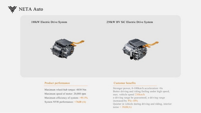 ผลิตภัณฑ์ชิ้นที่สามคือ โฮซอน อิเล็กทริค ไดรฟ์ ซิสเต็ม (HOZON Electric Drive) ระบบขับเคลื่อนไฟฟ้าสมรรถนะสูงซึ่งเปรียบเสมือนเป็น “หัวใจ” และ “กล้ามเนื้อ” ที่แข็งแกร่งของยานยนต์อัจฉริยะจาก NETA ระบบขับเคลื่อนไฟฟ้าถูกแบ่งออกเป็นสองประเภท ได้แก่ ระบบขับเคลื่อนด้วยไฟฟ้า 180 กิโลวัตต์ 400 โวลต์ และระบบขับเคลื่อนด้วยไฟฟ้า 250 กิโลวัตต์ 800 โวลต์ แบบ SiC ซึ่งมาพร้อมคุณลักษณะสำคัญ 4 ประการคือ “ประสิทธิภาพสูง ระยะทางในการขับขี่ที่ไกลขึ้น มอบความสบายเหนือระดับ และระบบที่เสถียร” ระบบขับเคลื่อนไฟฟ้าสมรรถนะสูง HOZON Electric Drive มอบอัตราเร่งที่เหนือกว่า ขับขี่ได้ไกลขึ้น มาพร้อมความสะดวกสบายรวมถึงเสถียรภาพในการขับขี่ มอบประสบการณ์การขับขี่เหนือระดับโดยไม่ต้องกังวลเรื่องการชาร์จอีกต่อไป