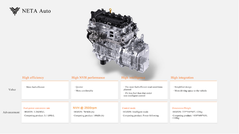 Mr. Chen Lingping (เฉิน หลินผิง) จาก NETA สรุปว่า “HOZON ได้เริ่มผลิต Range Extender รุ่นแรกไปแล้ว และกำลังอยู่ในขั้นตอนการพัฒนารุ่นต่อไป ซึ่งจะมีฟีเจอร์ที่ล้ำสมัยยิ่งขึ้น ฟีเจอร์เด่นอย่างหนึ่งของ Range Extender เจเนอเรชันใหม่คือระบบควบคุมอัจฉริยะแบบบูรณาการระหว่างมนุษย์ - ยานยนต์ - และถนน ซึ่งจะประสานการทำงานระหว่างระบบต่างๆ ได้อย่างมีประสิทธิภาพมากขึ้น อีกฟีเจอร์หนึ่งคือเครื่องกำเนิดไฟฟ้าซึ่งเพิ่มประสิทธิภาพการแปลงพลังงานจากน้ำมันเชื้อเพลิงเป็นไฟฟ้าสูงสุดถึง 3.4 กิโลวัตต์-ชั่วโมงต่อลิตร และมอบประสบการณ์การขับขี่ที่ปราศจากเสียงรบกวน โดยมีระดับเสียงเพียง 75 เดซิเบลเท่านั้น”