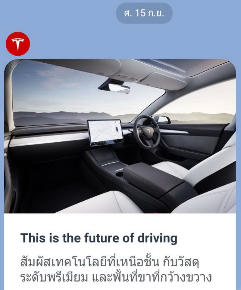 Tesla ประเทศไทย ใกล้เปิดตัว Tesla Model 3 รุ่น Minor Change ที่อัพเกรดใหม่ทั้งคัน ชาร์จเต็มวิ่งได้ 681 กม. หลังจากปล่อยภาพพร้อมข้อความโปรโมตสั้นๆผ่าน LINE Official Account คาดเปิดตัวเร็วๆนี้