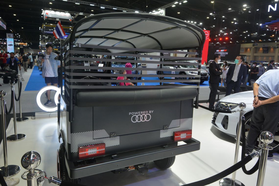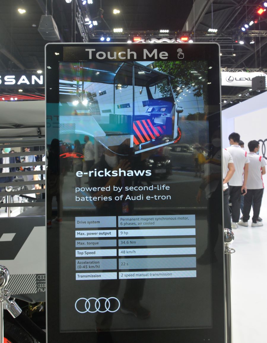 แบตเตอรี่ไฟฟ้าของ Audi e-tron เป็นแบบ high-energy density ซึ่งมีประสิทธิภาพสูง ถึงแม้ว่าแบตเตอรี่ดังกล่าวจะเคยถูกใช้มาแล้วในรถทดสอบ Audi e-tron แต่ยังมีกำลังไฟที่เพียงพอ สำหรับการนำไปปรับใช้ในรถตุ๊กตุ๊กที่มีมอเตอร์ไฟฟ้าที่กำลังน้อยกว่าได้เป็นอย่างดี ถือเป็นการพิสูจน์ในคุณภาพของแบตเตอรี่ใช้แล้วของ Audi e-tron ว่ายังสามารถนำไปใช้ต่อได้ สะท้อนวิสัยทัศน์ “The mobility of the future” การขับเคลื่อนแห่งอนาคตของอาวดี้ ที่มุ่งมั่นจะเป็นแรงผลักดันสำคัญในการสร้างโลกแห่งอนาคตที่น่าอยู่อย่างยั่งยืน ด้วยการนำเทคโนโลยีที่ก้าวหน้า มีความคิดสร้างสรรค์ และความกระตือรือร้นที่จะสร้างสังคมที่น่าอยู่