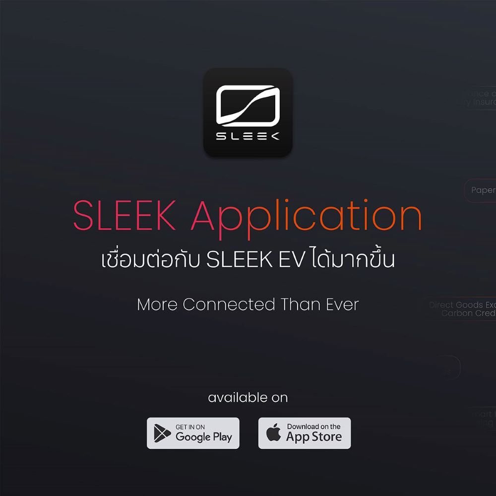 SLEEK Application เป็นแอพพลิเคชั่นที่ได้รับการออกแบบมาเพื่อให้ประสบการณ์การใช้มอเตอร์ไซค์ EV ที่ราบรื่น สะดวกสบายสำหรับเจ้าของ SLEEK EV โดยแอปนี้นำเสนอฟีเจอร์มากมายเพื่อยกระดับการเดินทาง ทั้งข้อมูลเกี่ยวกับรถ ตารางซ่อมบำรุง ระดับแบตเตอรี่ รวมทั้งฟังก์ชั่นค้นหาสถานีชาร์จ ตลอดจนสิทธิประโยชน์จาก S Token เพื่อแลกซื้อสินค้าต่างๆ เช่น กาแฟ อาหารแมว กระเป๋าสะพาย ฯลฯ