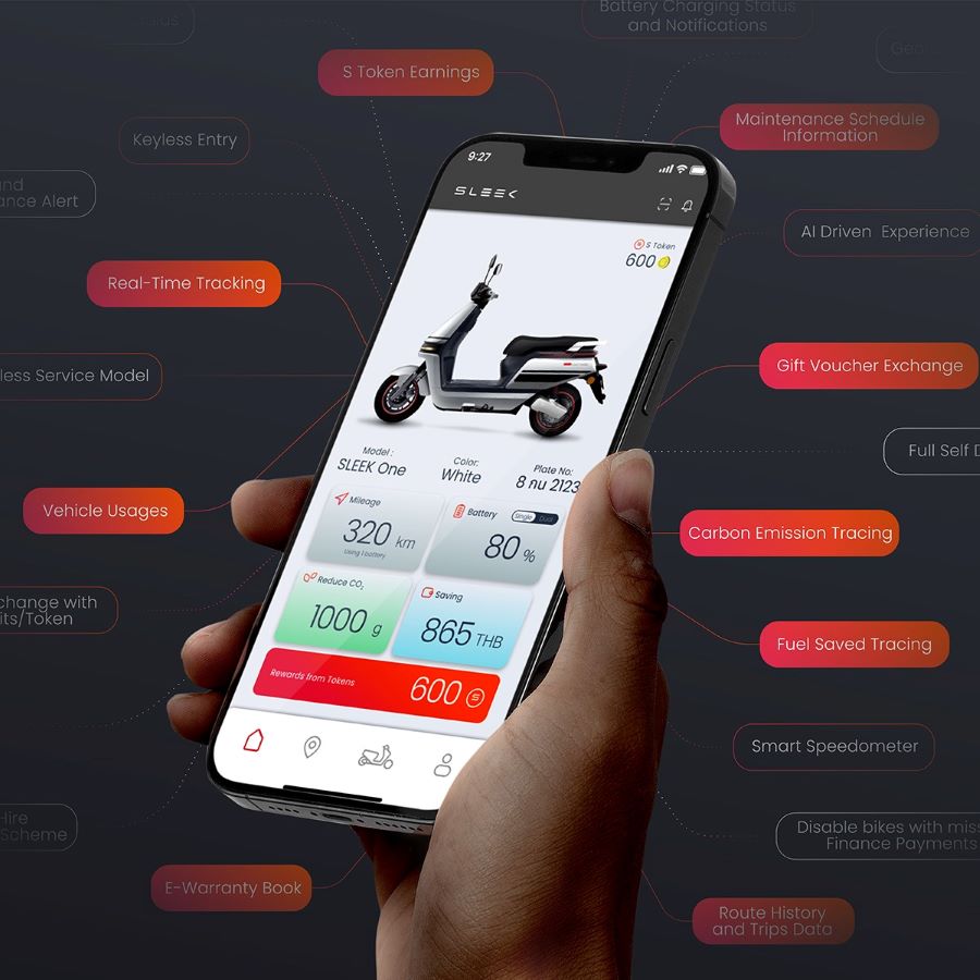 SLEEK EV TYPE-V GT 'Horizon Edition' เปลี่ยนโฉมใหม่ให้ดูพรีเมี่ยมกว่าเดิม และเพิ่มความพิเศษด้านเทคโนโลยีด้วยระบบเชื่อมต่อตัวรถกับแอปพลิเคชัน SLEEK ที่มีฟีเจอร์ยกระดับการใช้งานมอเตอร์ไซค์ไฟฟ้า ทั้งข้อมูลระดับแบตเตอรี่ ฟังก์ชั่นค้นหาสถานีชาร์จ ตลอดจนสิทธิประโยชน์จาก S Token เพื่อแลกซื้อสินค้าต่างๆ เช่น กาแฟ อาหารแมว กระเป๋าสะพาย ฯลฯ