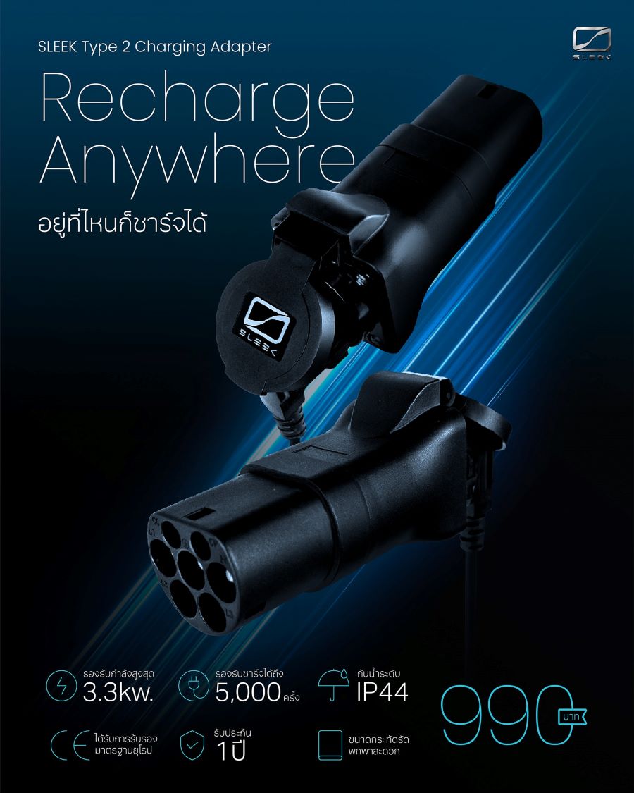 นอกจากนี้ยังเข้าถึงการชาร์จที่ง่ายกว่าด้วย SLEEK Type-2 Charging Adapter หัวแปลงชาร์จจาก SLEEK EV ที่ทำให้สามารถชาร์จมอเตอร์ไซค์ไฟฟ้าคันโปรดได้ทุกที่ทุกเวลา รองรับกำลังไฟสูงสุดที่ 3.3 กิโลวัตต์ รองรับการชาร์จได้ 5,000 ครั้ง กันน้ำระดับ IP44 และได้รับการรับรองมาตรฐานสากล (CE Standard) ราคา 990 บาท
