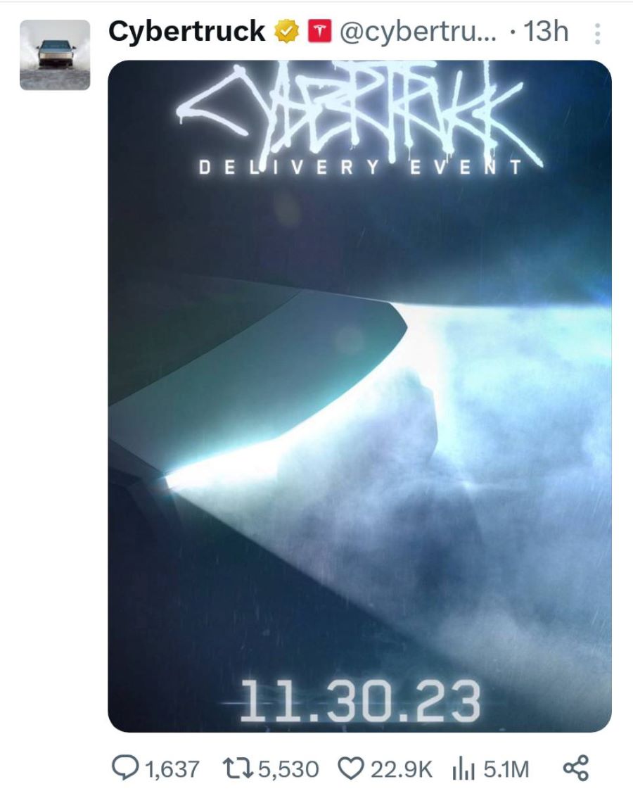 คลอดกำหนดการแล้ว! Cybertruck อภิมหารถกระบะไฟฟ้ามีกำหนดส่งมอบอย่างเป็นทางการ 30 พ.ย. 2566 หลังจากโพสต์ใน X เป็นภาพพร้อมข้อความว่า “11.30.2023 DELIVERY EVENT” คาดเคาะราคาขายจริงสูงกว่า 1.5 ล้าน