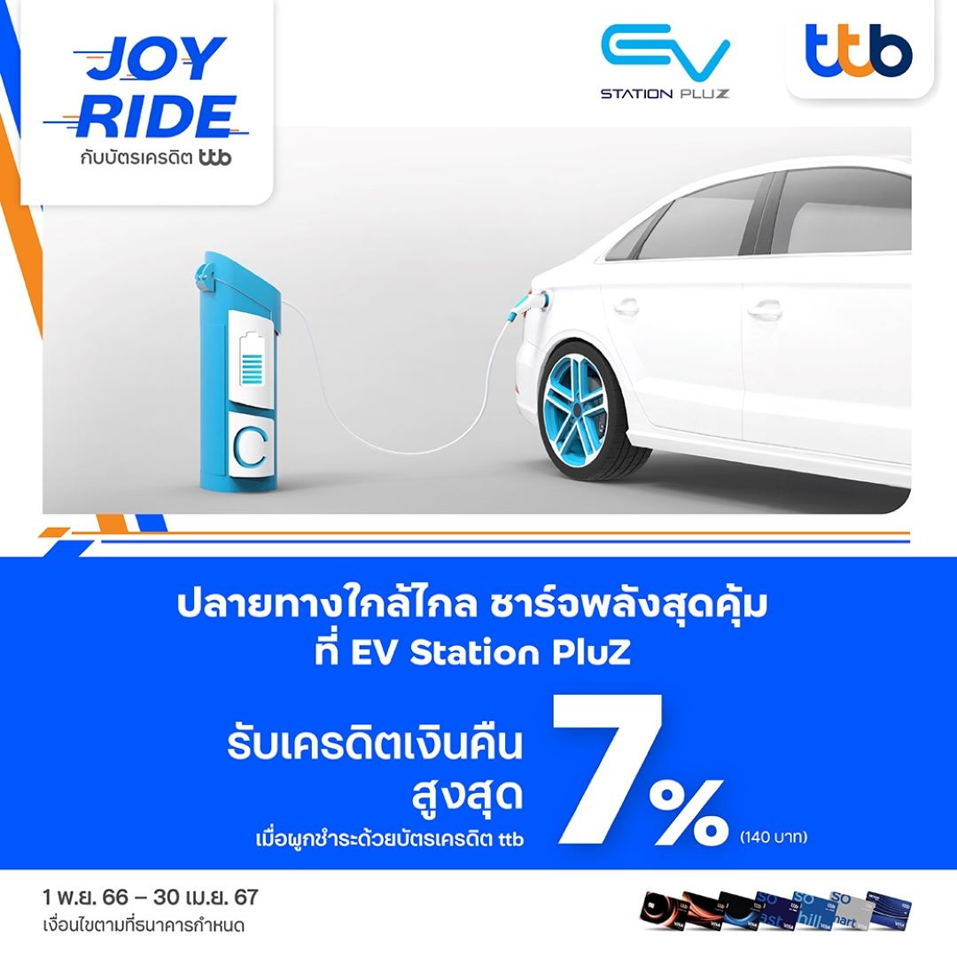 3.EV Station PluZ ร่วมกับบัตรเครดิต ttb จัดโปรโมชั่นพิเศษ รับเครดิตเงินคืนสูงสุด 7% เมื่อผูกชำระในแอปพลิเคชัน EV Station PluZ ด้วยบัตรเครดิต ttb ตั้งแต่วันที่ 1 พ.ย. 66 – 30 เม.ย. 67 เพียงลงทะเบียนรับสิทธิ์ผ่านแอป ttb touch หรือส่ง SMS พิมพ์ EVC ตามด้วยหมายเลขบัตรเครดิต 12 หลักสุดท้าย ส่งมาที่ 4806026 (อัตราค่าส่ง SMS ขึ้นอยู่กับเครือข่ายผู้ให้บริการ)