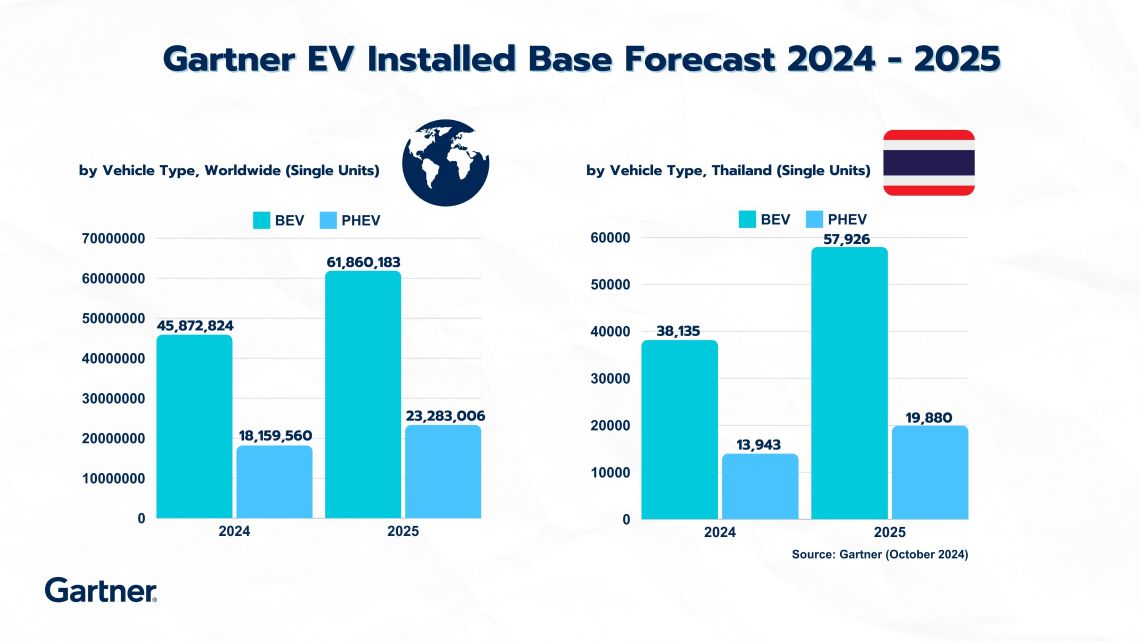 BANGKOK, Thailand., October 28, 2024 — By the end of 2025, 85 million electric vehicles (EVs) - cars, buses, vans and heavy trucks – are expected to be on the road,according to the latest forecast by Gartner, Inc.